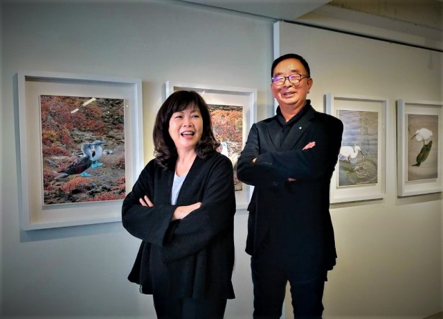 麗明營造董事長吳春山(右)在龍寶建設董事長張麗莉(左)鼓勵下,88幅精彩作品2月於台中臻品藝術中心展出。(記者黃玉燕/攝影)