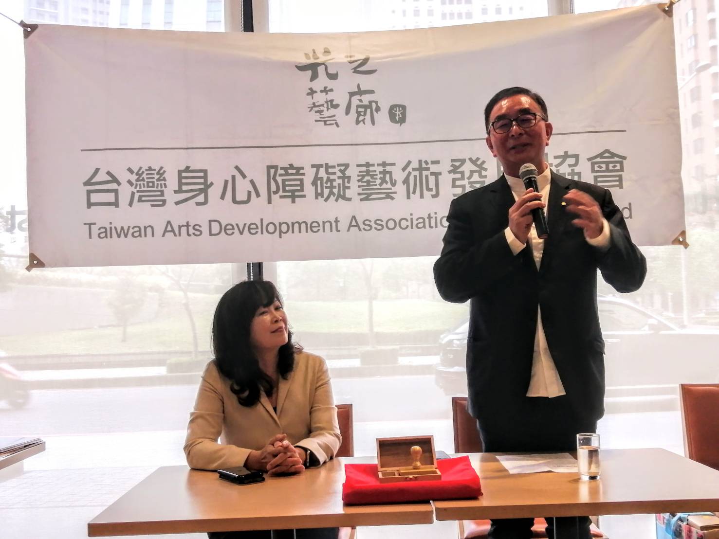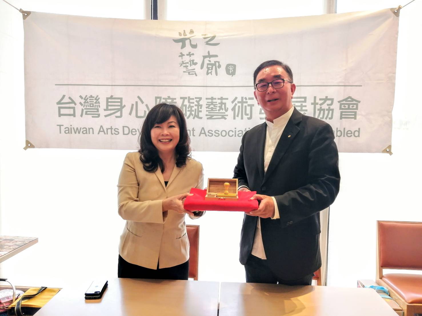 【大成報記者蕭宇廷/臺中報導】台灣身心障礙藝術發展協會於本月18日,在「光之藝廊」舉辦第六屆第一次會員大會,第五屆理事長龍寶建設董事長張麗莉期滿卸任,由麗明營造董事長吳春山接任第六屆理事長。而張麗莉任內,持續透過她的影響力把「光之藝廊」介紹給各界人士;接任的吳春山長年來,也一直投身於公益活動,他期許在未來任內可以發揮拋磚引玉的效果,創造藝術家與企業間的雙贏局面。