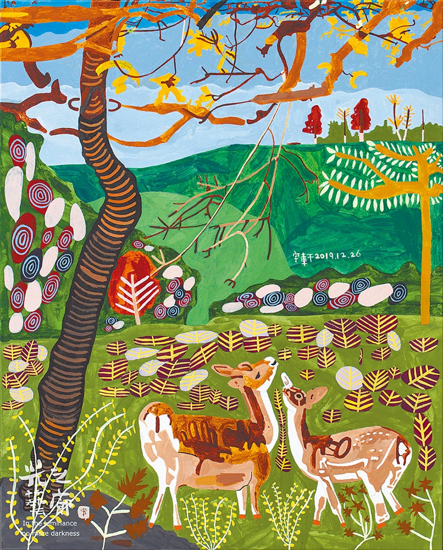 今年大學畢業的宇軒正朝著專業藝術創作者為目標努力邁進,宇軒的創作技巧逐年進步,風格也漸趨明確,豐富的用色及疊加的圖騰元素,讓人一眼便能認出宇軒作品的獨特魅力。此次展覽主題【與你一起____】,期望透過宇軒的精彩作品,與觀眾一起走入宇軒的世界。