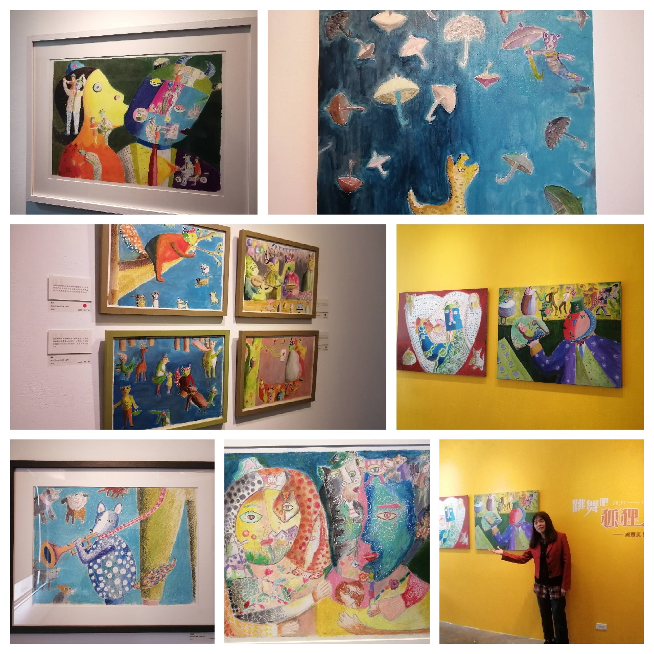 這次的展覽主題「跳舞吧!狐狸」,是取自於另一件故事創作,其中的狐狸就是藝術家本人的化身;透過作品期許自己與觀眾,即使面對重重困境與挑戰,也要愉快地面對人生。