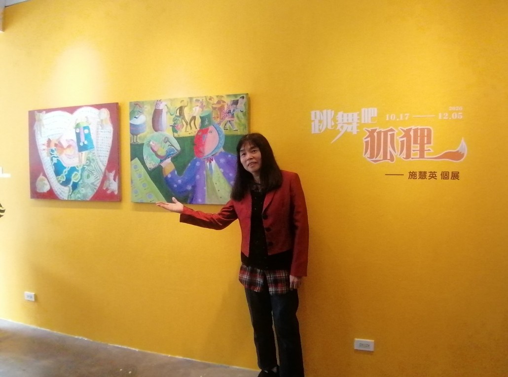 這次的展覽主題「跳舞吧!狐狸」,是取自於另一件故事創作,其中的狐狸就是藝術家本人的化身;透過作品期許自己與觀眾,即使面對重重困境與挑戰,也要愉快地面對人生。