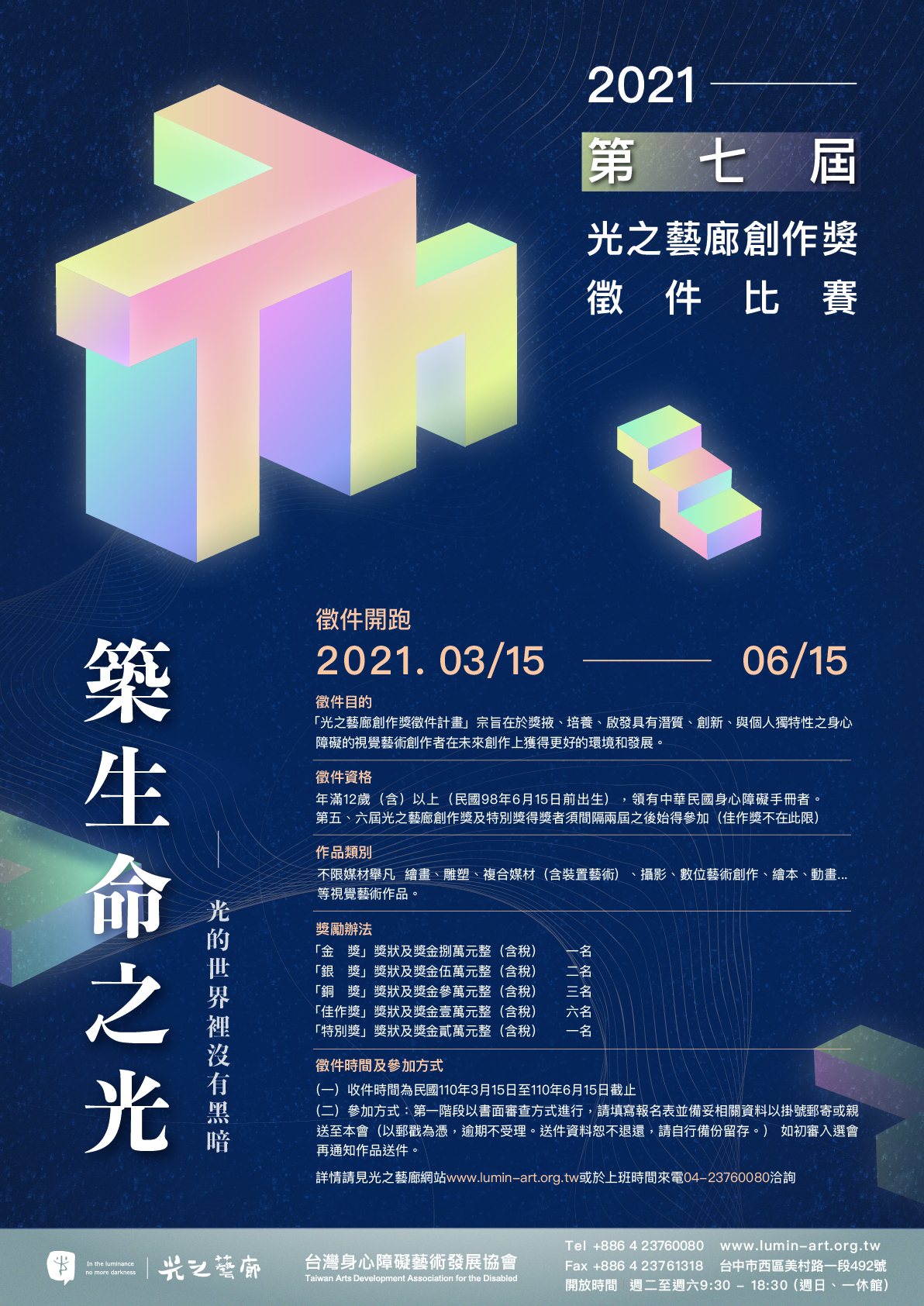 光之藝廊徵件比賽迄今邁入第七屆囉!即日起至 2021 年 6 月 15 日止 7月 31 日止,等您一起共襄盛舉!