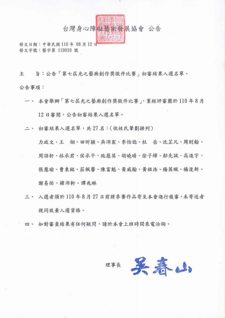 緊接著複審將進入實體作品的審查,請各位入選參賽者在8/27以前將參賽作品寄至光之藝廊,我們也會陸續與各位入選者聯繫作品寄送事宜,如果沒接到電話或信件的入選者也可以直接與我們聯繫唷!對於初審結果有任何疑問的朋友,也歡迎來電詢問!再次感謝所有的參賽者!^^