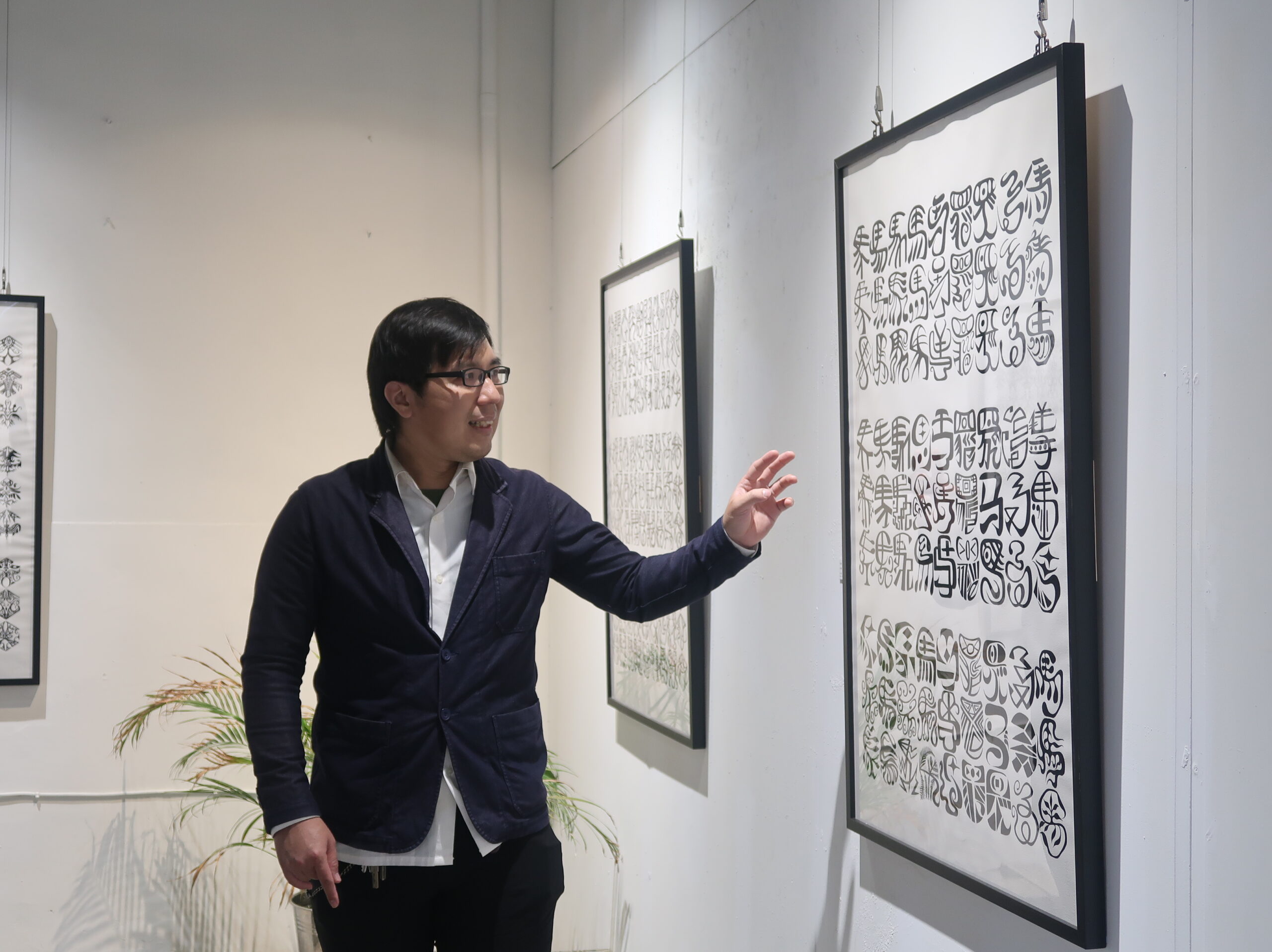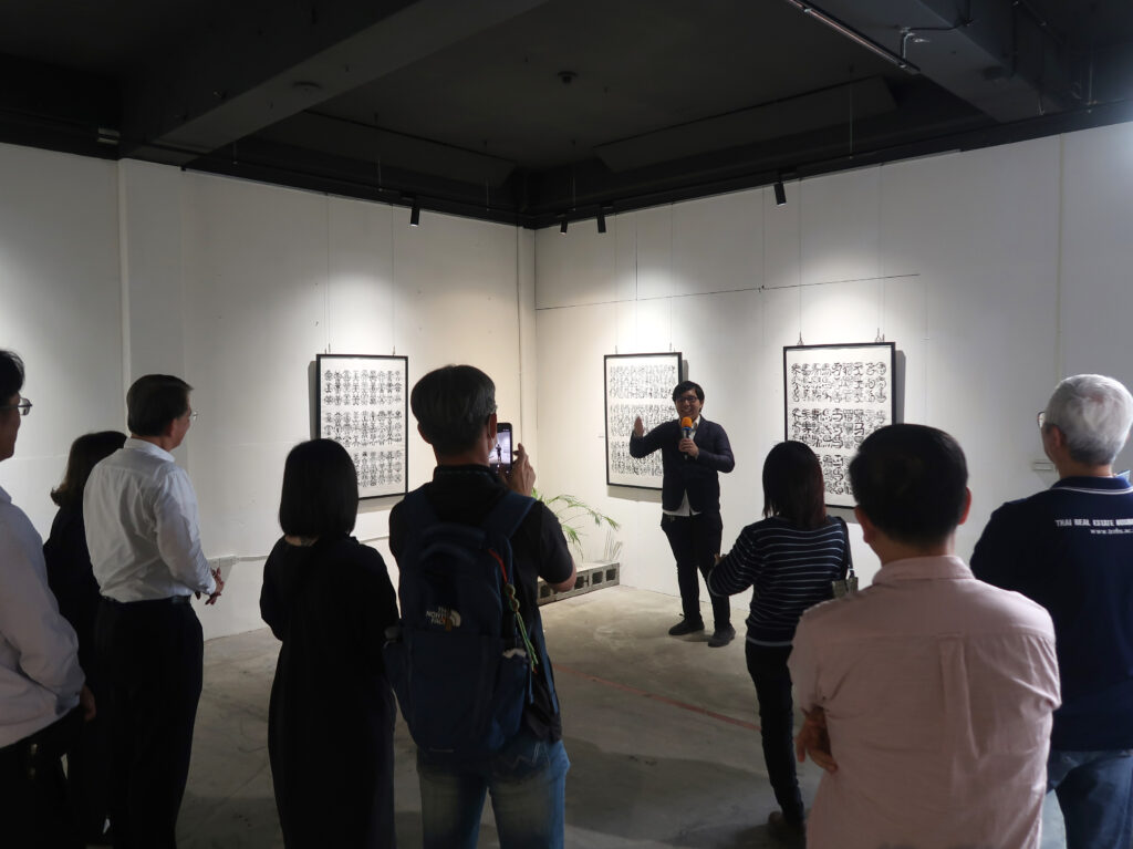 本次展出主角力政文,因自閉症特質展現出與眾不同的「水平思考」,童年時在繪畫中找到安定與專注,逐步建立個人創作體系。他擅長將文字的骨架拆解、重組並抽象化,至今已發展出近120種獨創字體。每個符號都是他對生活的觀察與思考,是個人化表達方式。